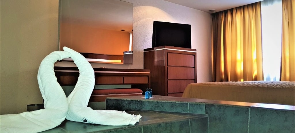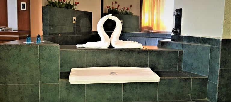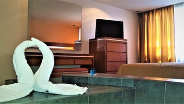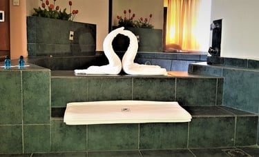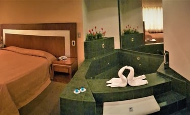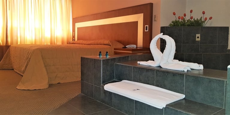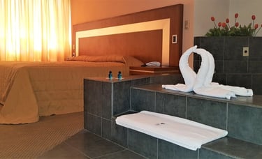 Nuestra Premium Suite Jacuzzi redefine el concepto de descanso. Equipada con una cama King-Size y un amplio jacuzzi privado, es el espacio ideal para relajarte en un ambiente íntimo, elegante y confortable.