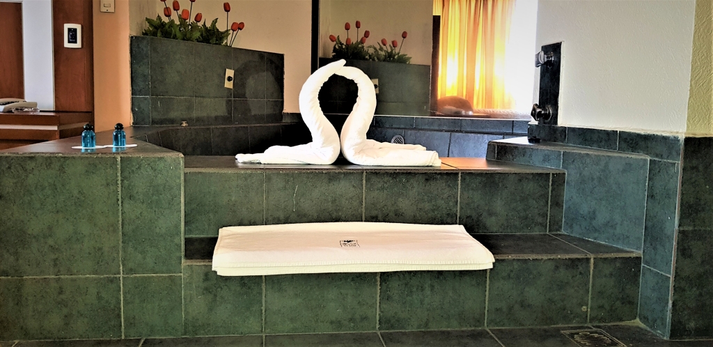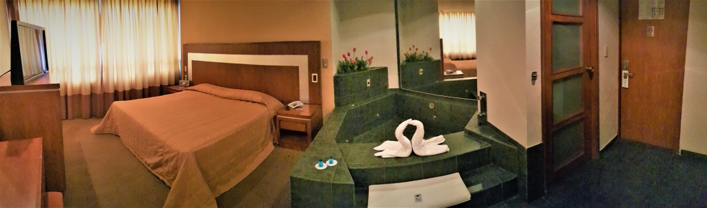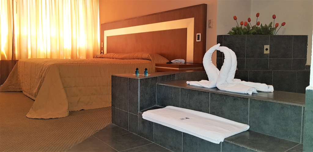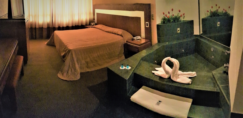 Acogedora suite con capacidad para dos personas. Cuenta con una cama King-Siza y un amplio jacuzzi. Ideal para su relax. Equipada también con pantalla LED de 32”, T.V. digital HD satelital, música ambiental, internet inalámbrico de alta velocidad y todos los servicios que el Hotel ofrece.